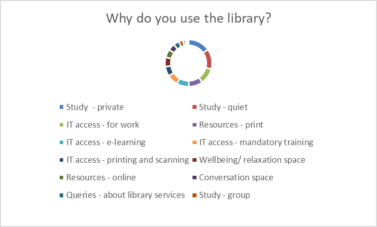 As expected, study, IT access and resource access were the most frequently stated uses. 20 people indicated wellbeing and relaxation, 14 a general conversation space. Notably, almost all participants returned multiple uses, indicating that encouraging first use can lead to further uses.