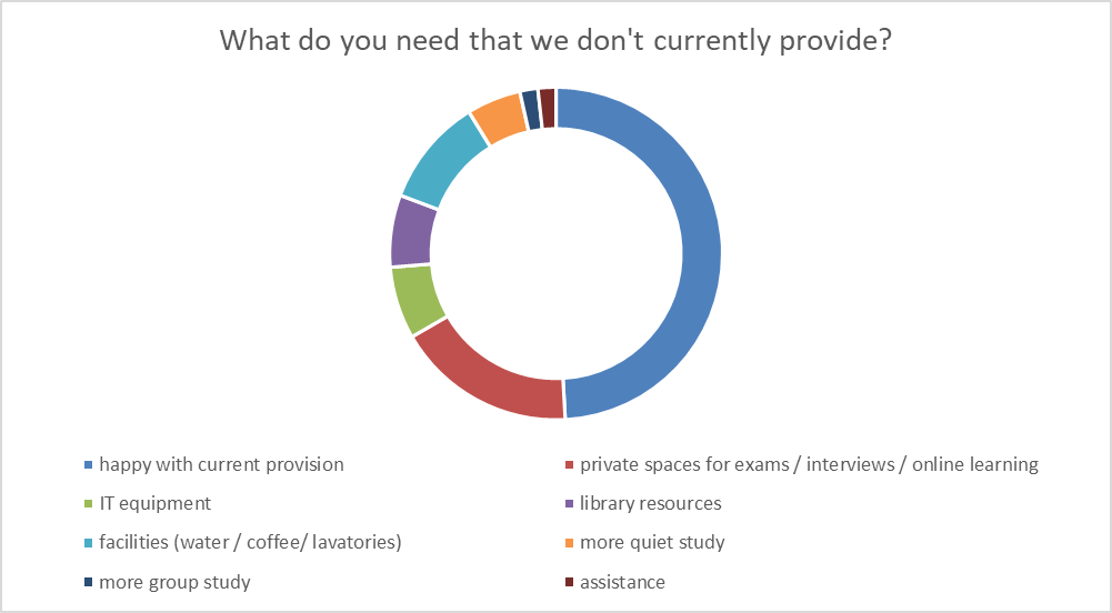 Nearly half of people were happy with the current provision, but the most frequently stated need was for private spaces for online learning / interviews or exams.